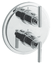 The flow control required will depend upon whether the mixer can feed two outlets (eg bath and shower or 2x shower outlets) or only one outlet (eg shower). The cartridge for flow to two outlets will usually incorporate a diverter (aquadimmer) function which allows it to turn in both clockwise and anticlockwise directions from a central off position. Most flow cartridges are based upon ceramic disk technology requiring only a part turn to be fully on, a few are based upon conventional screwdown valves requiring multi turns. Often the only difference between mixers feeding two outlets and those controlling one outlet is the flow cartridge and the flow handle.